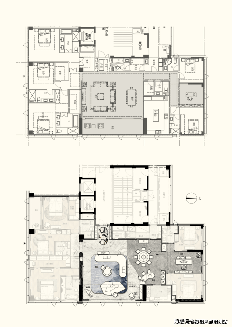 于新一代大平层而言,空间创作即是与生活共情,让艺术为空间创造价值。可以看到从原始平面图与修改后的设计图纸对比,在原始建筑平面基础上,采用「化整为零」的空间处理法,将阳台纳入室内,扩大原有公区面积,释放空间边界,打破动线区隔,形成一体化的“双客厅”概念。