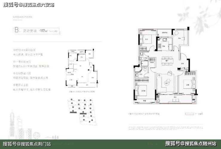 如果预算允许,可以直接117方四房改善。建面约117方四房两厅两卫户型,为标准的四叶草布局,空间尺度更为阔绰。三开间朝南面宽达到了约10.4米,客厅与次卧贯通的长阳台近6.8米长,不仅通风采光更好,也为晾晒、花草养护等提供了更多的生活情趣。