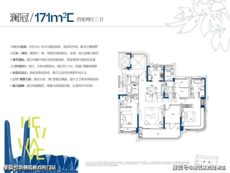 约171㎡大四房:三卫双套房,南向面宽约15.5米,主卧带L型转角飘窗,总价约700万实现终极改善。