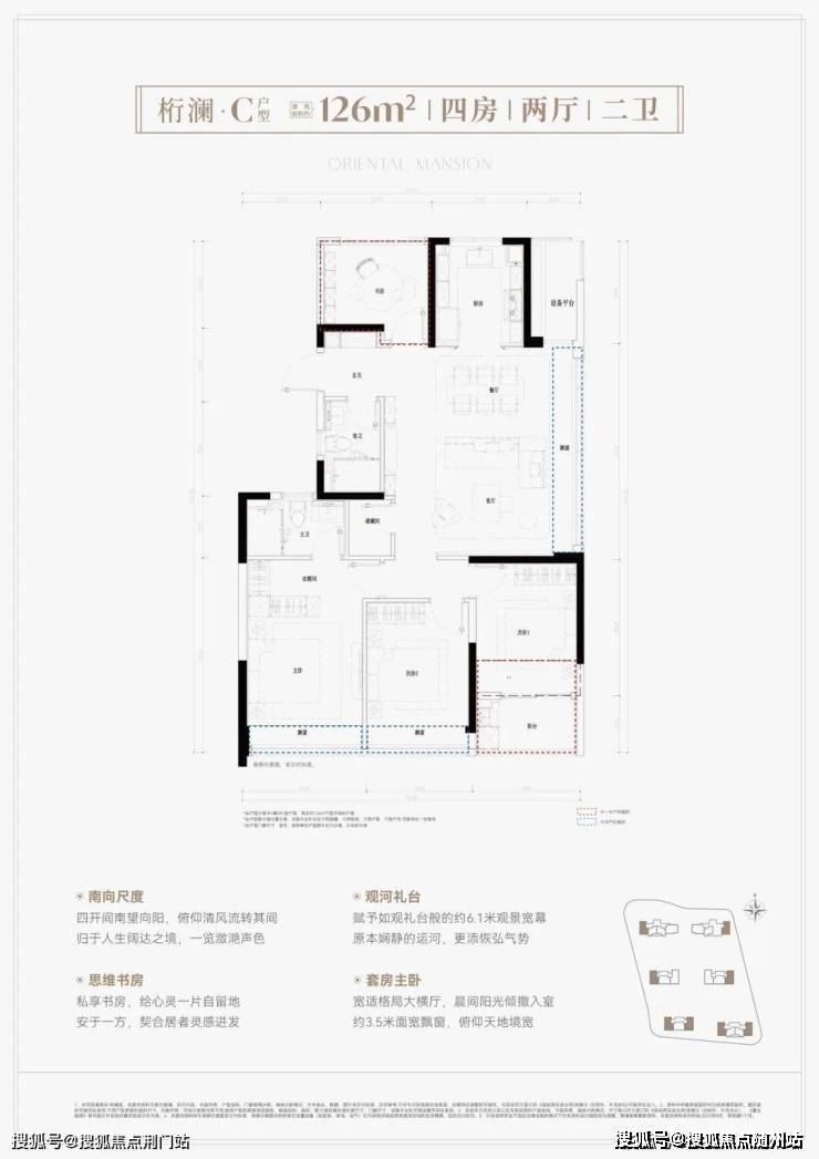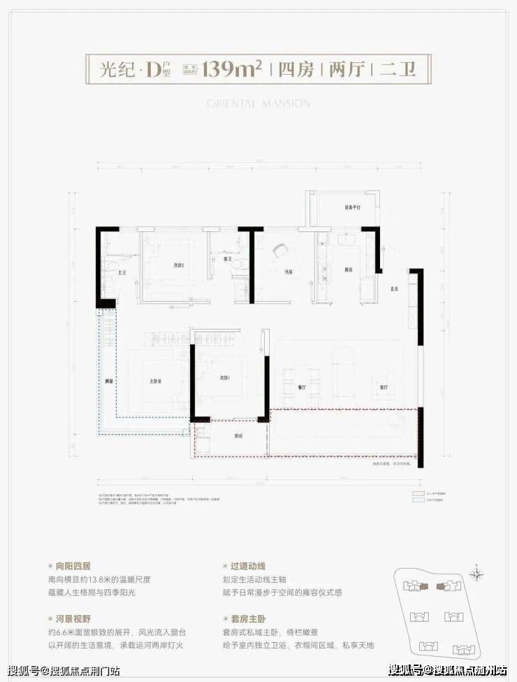 139㎡ 四房两厅两卫:高端改善,南向大横厅,主卧 270° 转角窗,尺度舒适。