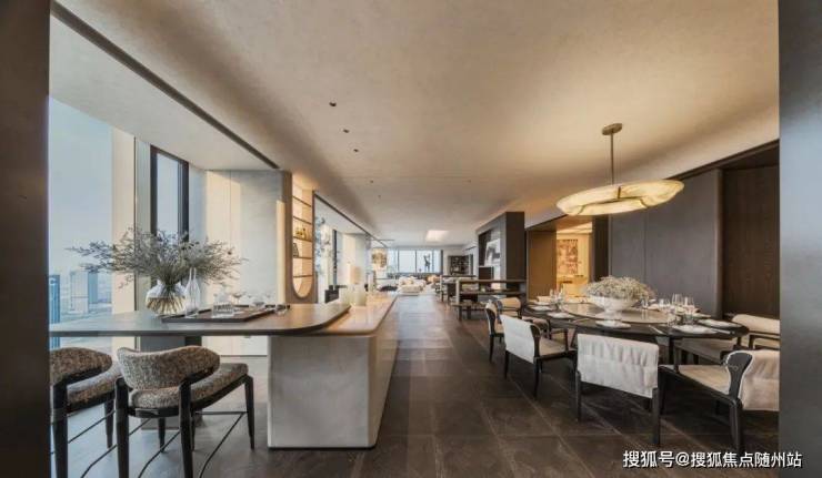 建面约 560㎡「归逸」重塑居住的精神维度,即空间不仅是物理尺度的延展,更是居住本质的一场深度探索。 约8米进深的会客厅地面通铺珍贵石材,客厅背景墙选用意大利fendi白石材,大尺寸面积铺设石材纹路都做到完美拼接,如同一卷徐徐展开的绢本。