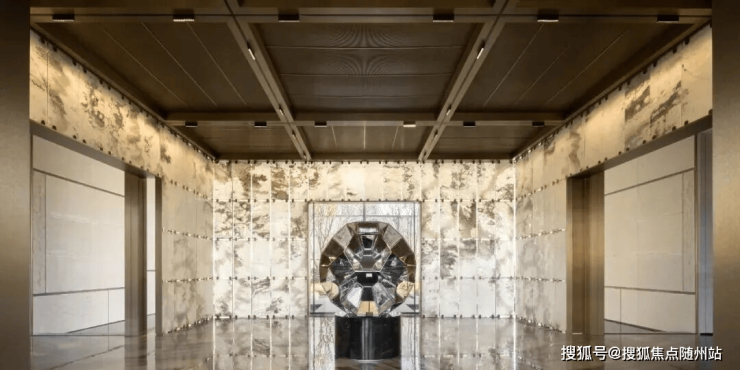 归家大堂被做成了极具东方意境的“金玉满堂”:定制的“缘起”艺术品、地面的静雅棕奢石、悬垂四周的水墨玉石墙,每一寸肌理,都散发着奢玉的温润与高雅。