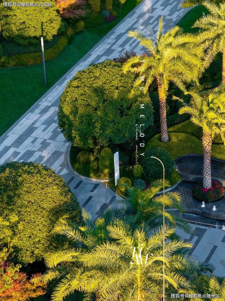 入口处的迎宾水景是园林的点睛之笔,池底设计为盛放的牡丹图案,周边种植着从10000多公里外移植而来的加那利海枣树,瞬间提升了园区的度假感。夜幕降临时,池中满载星河剪影,与周边的高品质建筑内透光相映成趣。