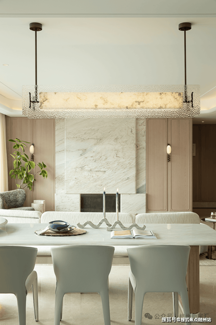 餐厅中,云石与琉璃共舞的吊灯,晕染出温润光域。几何烛台与玻璃花器于低语呼应,共呈舒适与精致并存的用餐场景。餐边柜静立于侧,咖啡的氤氲与酒香交织,将寻常三餐,升华为仪式感的盛宴。