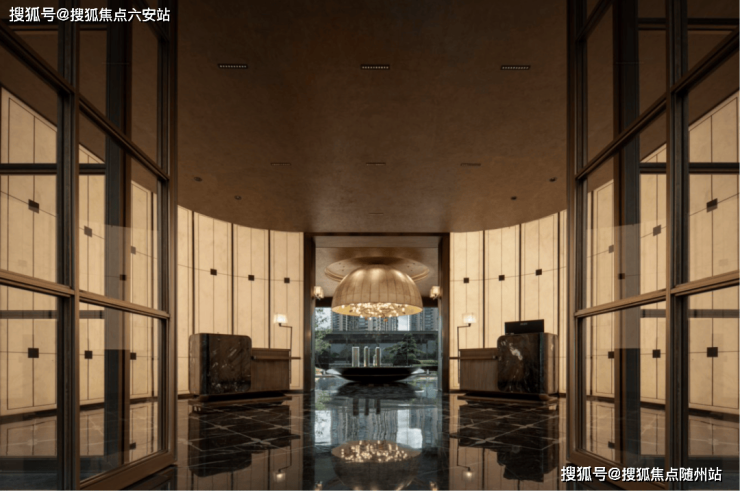 归家路径设计层层递进:星级酒店式门头、禅意水系、琉璃屏风、仪式廊桥等场景,结合自然光幕穹顶与香槟金吊顶,形成光影缓冲空间,营造全方位感官体验。