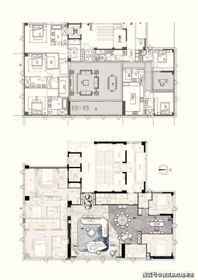 约300㎡“观湖”,谢柯打造;另一款是更宽舒的约412㎡“行云”,出自邱德光。尤其是约412㎡“行云”,无论玄关处雪花白、劳伦黑金、金世纪的大胆拼花,瓦楞式的波浪形电视背景墙,还是吸睛的普拉达绿石材吧台,全屋随处可见出色审美和奢华材质的完美结合。