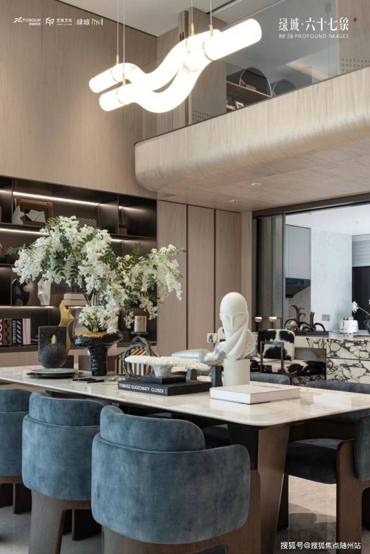 浪漫布置:跃象空间的堂室空间以浅色调为主,营造出一种简洁而清爽的氛围。木制桌腿餐椅和奢华大理石台面餐桌摆放其间,雕塑艺术品的点缀,加上桌面的复古场景,犹如一片美景,将艺术与法式经典生活情调完美结合。