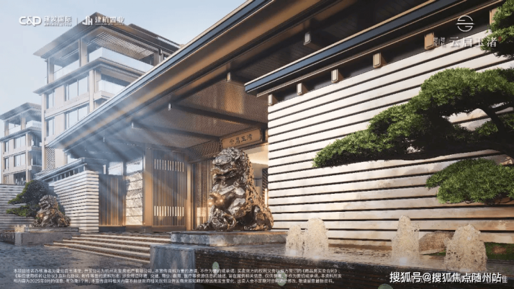 外立面融合良渚玉琮纹样与太和殿庑殿顶形制,复刻五步青云阶、铜狮镇守;园林以西湖郭庄为蓝本,打造“一轴两园十景”,约2700㎡下沉式庭院会所含恒温泳池、双私宴厅。