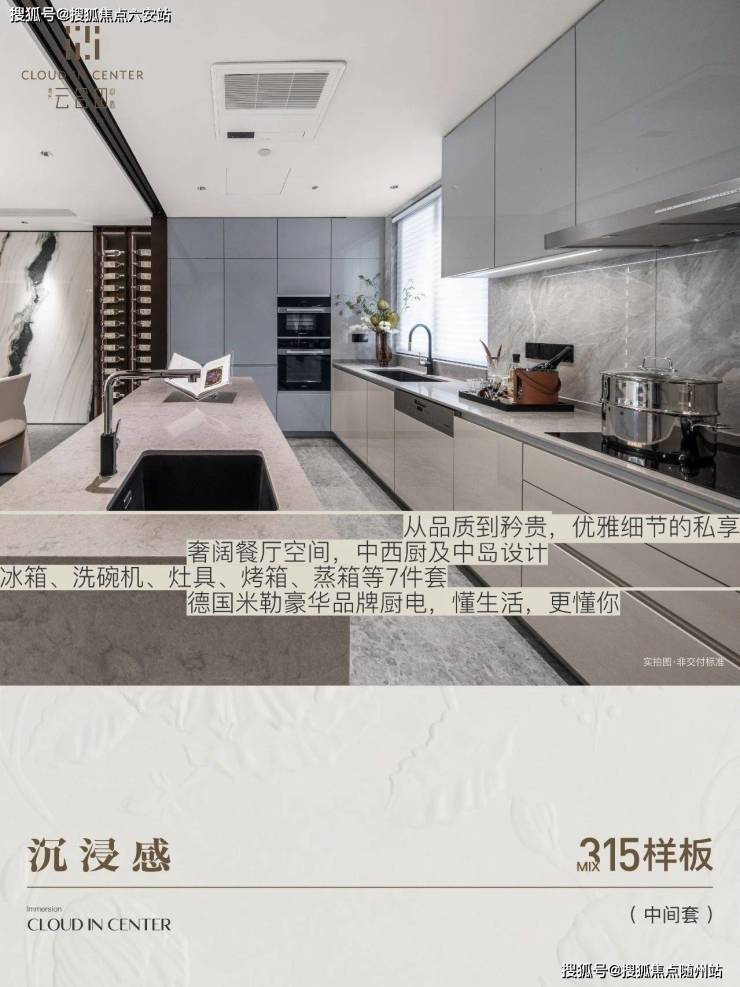 精装标准达15000元/㎡,中西双厨设计、电动夹丝玻璃移门、金属嵌条墙面等,兼顾美学与实用价值。