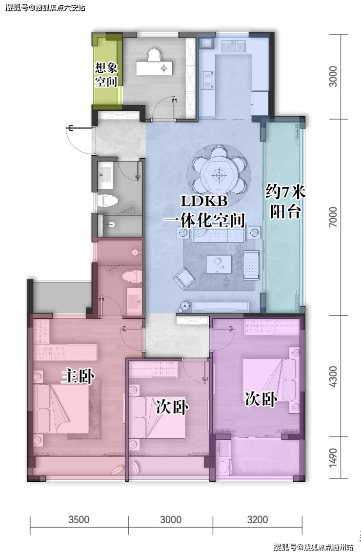 东面连接约7米阔绰阳台,套房式主卧,带飘窗、衣帽间和卫生间,全面覆盖男女主人的生活所需。周末坐在飘窗上看书喝茶,累了就靠枕小憩,还可设计为收纳的地方,为空间扩容。