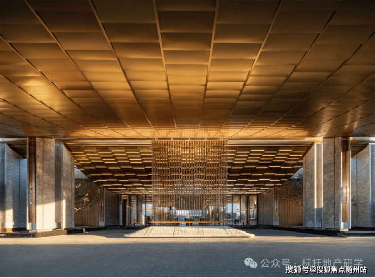 在凤起潮鸣,归家,即是一场艺术巡礼。项目主入口“凤起冕旒”,以现代建筑语汇转译古代帝王冠冕的仪制,85米长的门廊运用奢石、金属与6045颗手工景泰蓝旒珠,塑造出强烈的第一眼尊崇。