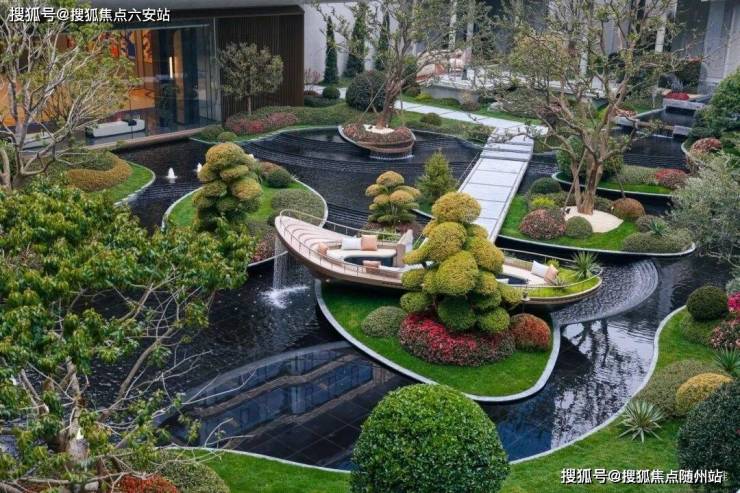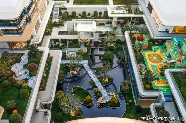 下沉式庭院,是一个个「聚宝盆」汇集而成。中间做了好几个观景台,周围一圈是退台和连廊,几乎可以在任何高度欣赏整座庭院:底部、高处、半空,视野都很开阔。底下的水院里,是一个又一个树池,一层又一层跌水,一棵又一棵名贵的铁冬青。跌水层次越多,成本就越高,这样精致浓烈的庭院,很有辨识度,不输豪宅。
