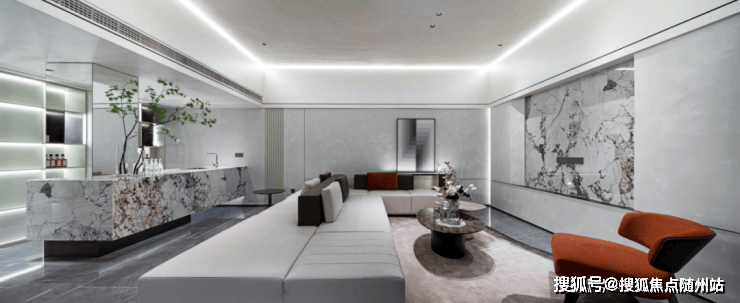 地下二层的会客厅是真富丽堂皇,大挑高的空间配上大吊灯,调性十足;高5.1米的巨型岩板使空间看起来很灵动。当然,所有装修风格以业主的主观意识为主,项目整体以毛坯交付,可以顺心而为。