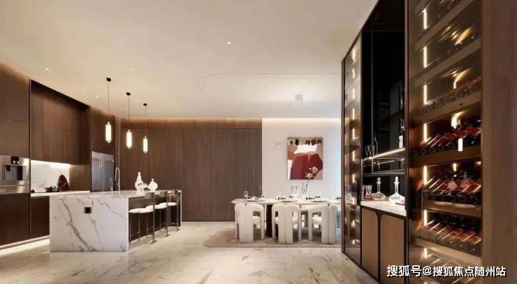 转过玄关,3.8米的层高,迎面而来的是一整排通顶的恒温酒柜,可以藏下几百瓶拉菲。