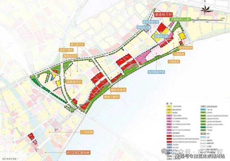 钱江新城二期横向以古海塘、滨江公园、连堡丰城、引水河为脊,纵向以通江水系和绿廊为脉,塑造通江连城的滨水多彩潮岸。