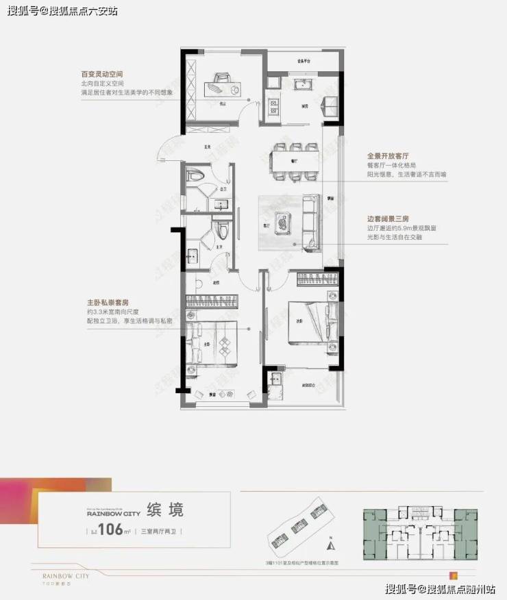 建面约106㎡边套户型,这在同面积段中尤为罕见。户型方正,客餐厅拥有约5.9米长飘窗,推门而入便能感受到极佳的视野与光线,居住舒适度大幅提升。