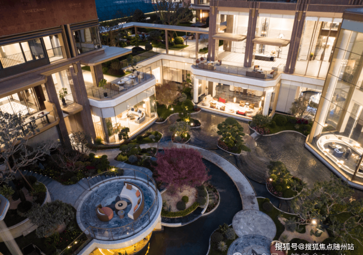 下沉式庭院示范区现已呈现的“高山流水”中芯景观,其超10米的高差寓意步步高升,庭院中层层叠叠的圆形铺装如玉盘叠翠,大小玉盘于林间穿梭,水幕、台地与悬浮廊架交相辉映,共同构筑出一幅既可赏玩又可徜徉的立体山水画卷,意境非凡、别具一格。