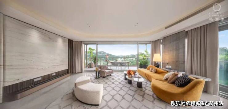 客厅背景墙、地面等根据不同主题,搭配海纳百川、白冰玉,或卡里冰玉等不同奢石铺装(不同户型的装修风格不同,具体以实际交付为准)。