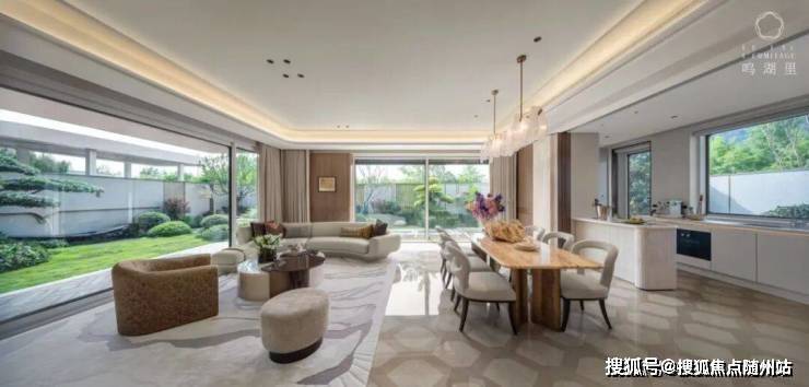 以建面约223㎡的下叠为例,一楼约11米的面宽,首先用阔奢的尺度,大气开场了约270°景观宽厅,为一体化的餐客厅开启了极致的“广角”视野。