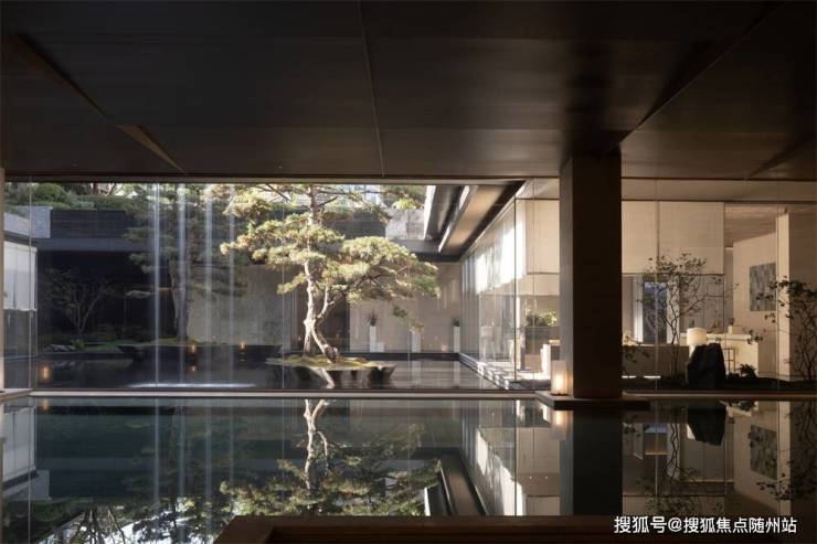 走过约40米和风游廊、黛色青瓦下,踏星而行,复现古时大宅堂前,实现四季有景、步移景异,在自然行径之中,构建「四水归堂」的风雅之景