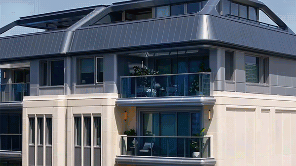 不同于传统叠墅立面的方正造型,其类高层产品设计形态难以满足真正的墅居体验。天阳·湖山丽舍则从欧洲古典建筑的竖向分割中汲取灵感,结合新艺术运动所广泛运用的自然曲线,通过灵动自由的波动墙体,形成连续弧形的建筑界面,创造出独特的"独栋感"视觉效果。