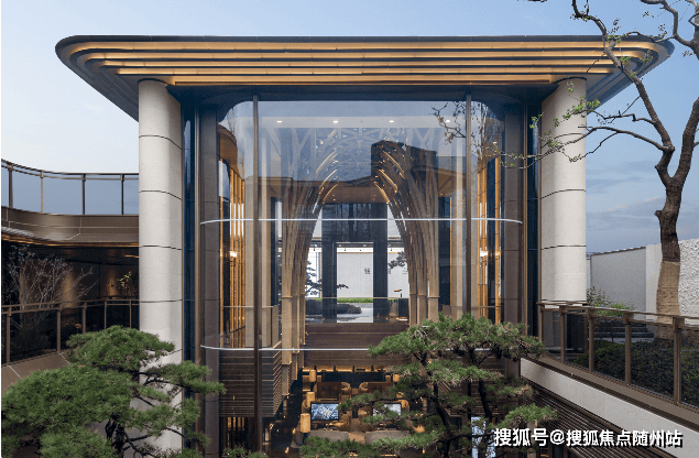 二进序厅:以水、风雨连廊、空中悬挑平台串联山水相依风雅景致 , 呈现三层立体园林及约 15 米飞石叠瀑景观。;