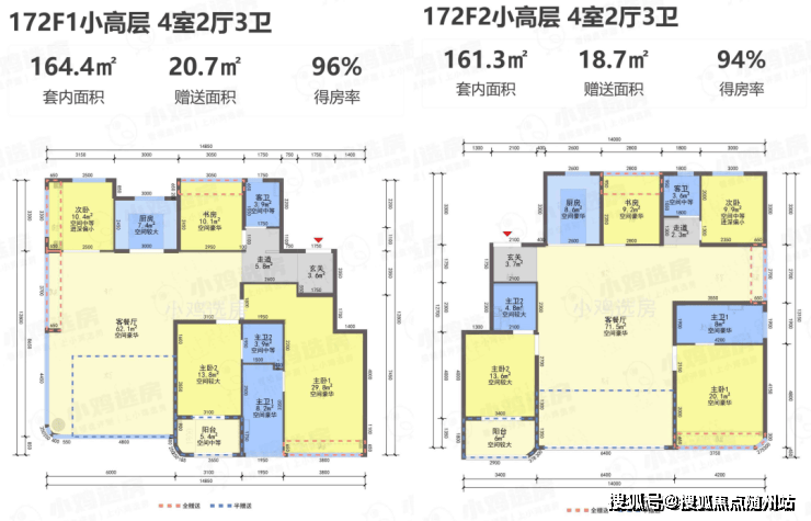 存在两种户型设计,得房率分别约96% 和94%。
