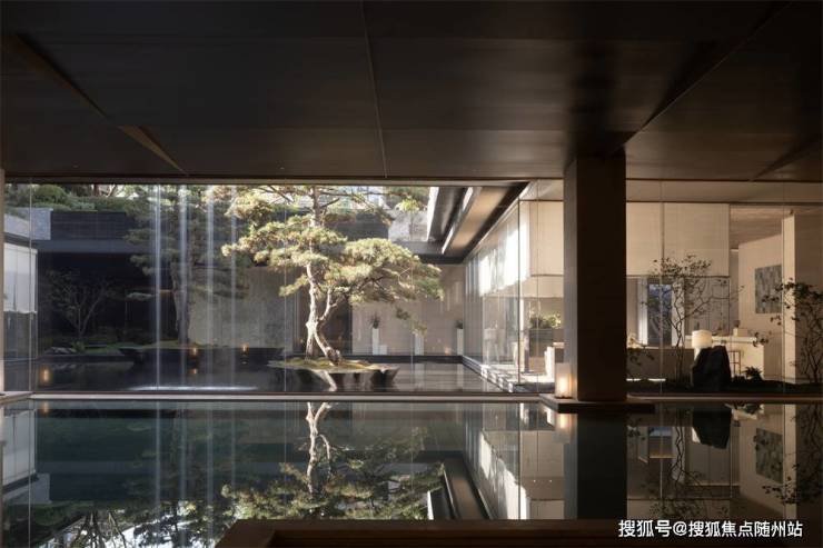 穿过大门,“踏水归廊”浅滩水景灵感源自“曲水流觞”,水流过纹理石材成细瀑,寓意“聚财纳福”;廊檐“月影入画”,椭圆穹顶投下光影与冬青树影交织,四季画面皆不同,宋画意境跃然眼前。