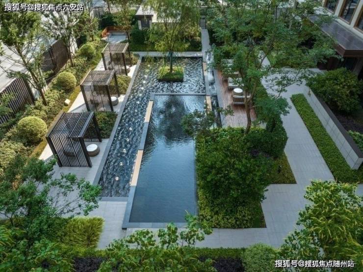 绿化率25%的“三庭四院”园林以《春江花月夜》为灵感,打造筑庭、林庭、石庭等七大主题景观,形成“出则繁华、入则自然”的过渡。