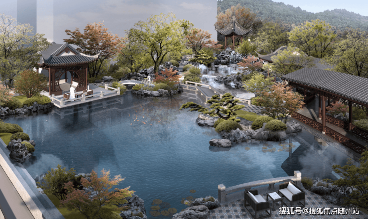 约1500m²的中央庭院,以灵动水景为魂,缀以亭榭楼阁,打造金水桥、四水归堂、宴宾台、烟波坊……十二处江南名景如珠玉散落,步移景异,俯仰皆成画卷。