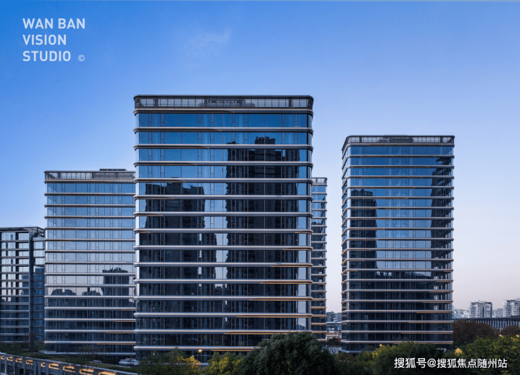 光是外立面就下足了成本。仔细看,它的四幢主体建筑并非常规的四方火柴盒,而是做了两侧内切,使剖面成为六边形,六个弧型转角,都是美妙的圆弧玻璃幕墙!