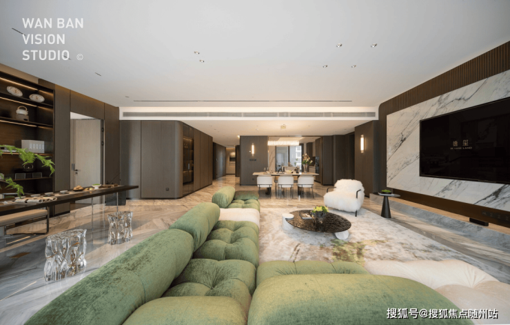 由于造价昂贵,杭州用这种石材的商业大平层不超过5个,许多顶豪也只舍得拿来作电视背景墙,在此,却奢侈地漫铺于地面和墙面上。
