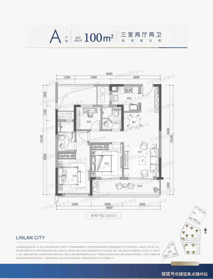 建筑面积约100㎡三房两厅两卫:
