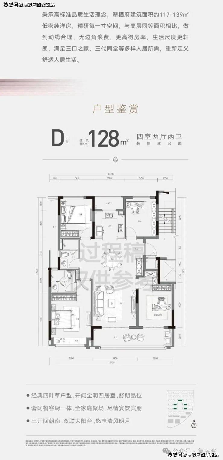 如果你的预算兼顾更大面积段的,建面约128方的四叶草户型和建面约139方的边套可重点关注,大面宽,动线流畅。