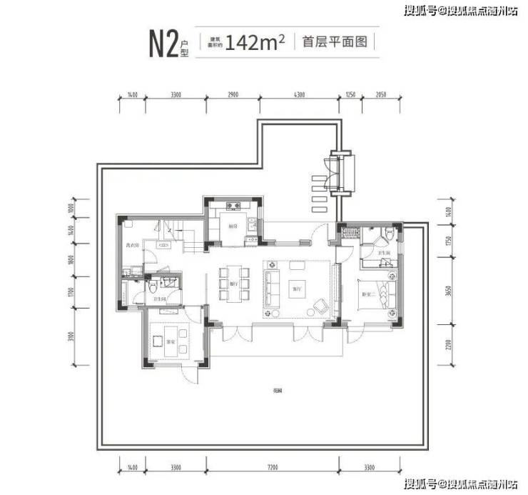 以约142㎡户型为例,面宽约15.2米,标准4房4卫。一楼是约7.2米长的双面采光大横厅,除了老人套房,还有个向院子伸出的“X空间”。它既能用作茶室、棋牌房,也能成为私密的客卧。