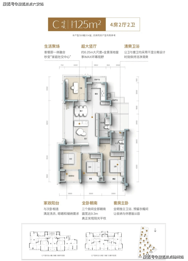 约9.3m南向面宽,全卧朝南,让每一室均享阳光的平等眷顾;