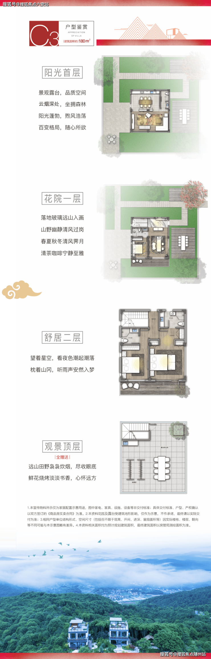 和庄云顶在产品设计上极具创新性,主推建面120-240㎡坡地独栋别墅,户户赠送150-600㎡私家庭院及40-60㎡观景露台。项目首创“三重立体景观”布局(露台+庭院+观景平台),实现山景与建筑的深度交融。建筑于山林间和谐“生长”,依山而建,低密宜居,与自然完美融合。