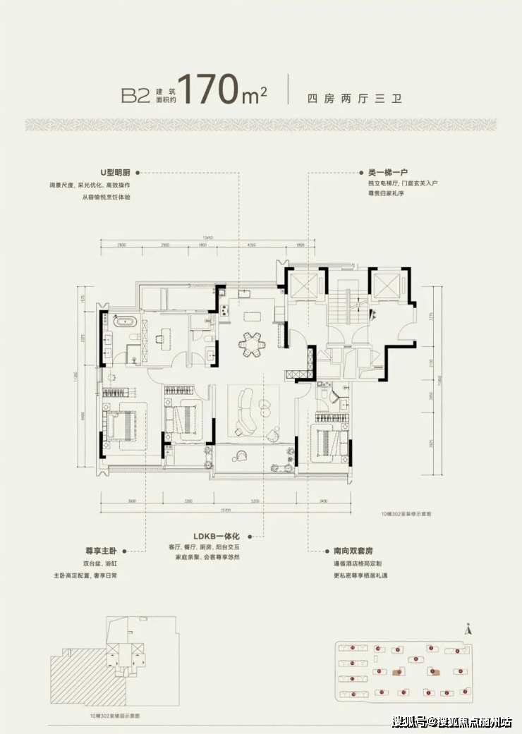 建面约170方B2户型,四房两厅三卫