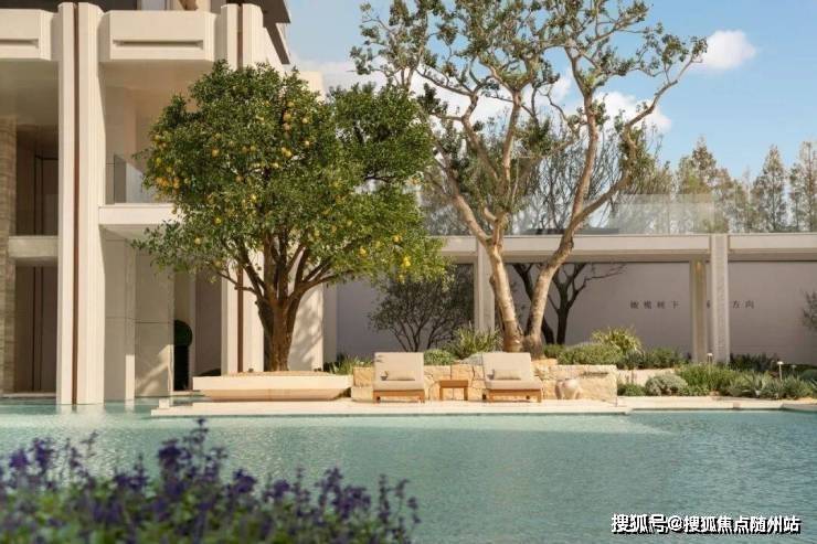 为此他们反复调试了水院底部的瓷砖颜色,以及水的深度,让它与纯色系的石材柱廊、立面,彼此呼应。同时,整个水系也用了和泳池类似的净水系统,不光要在销售阶段保持纯净,今后交付了,同样要打理得纯净透亮。