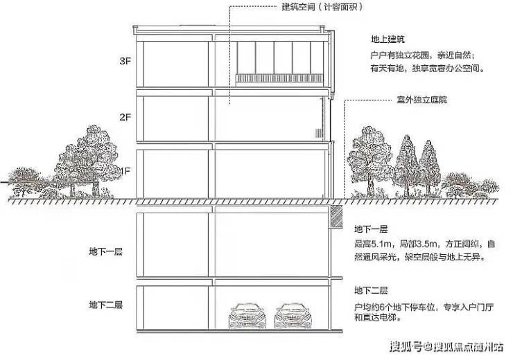 建面约450-1500㎡花园类办公,建面约335-580㎡商业,毛坯现房,总高3层,地下室总高6.6m。