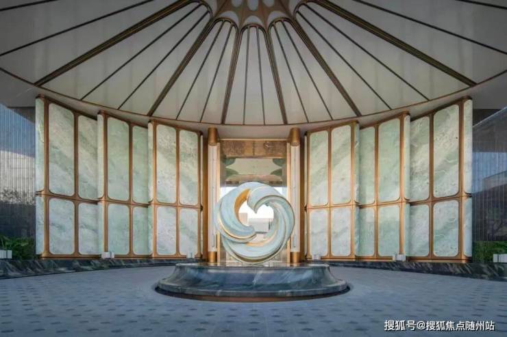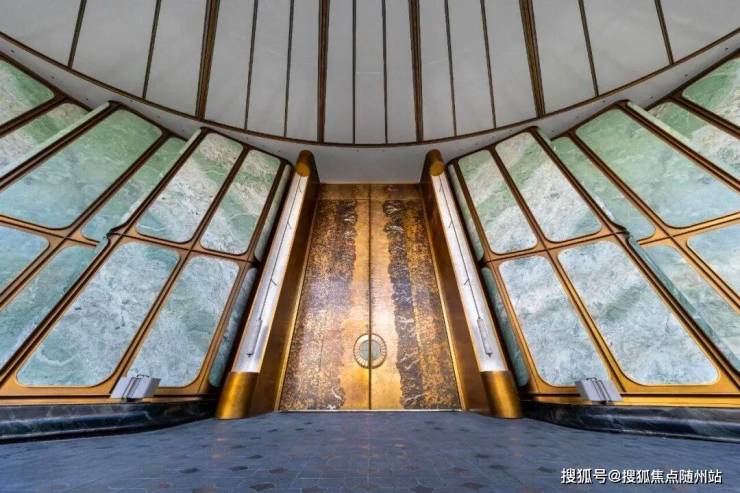 比如约56x11.5米的超尺度门庭,顶部以杭州折扇为造型灵感,寓意“藏风聚气”;四周还有12片巴西进口的百达翡绿奢石雕琢的玉石屏风;中间还有约9.6x5.3米的巨幅铜门,是由非遗传承人朱炳仁手工锻打,再现钱塘潮涌的磅礴气场。