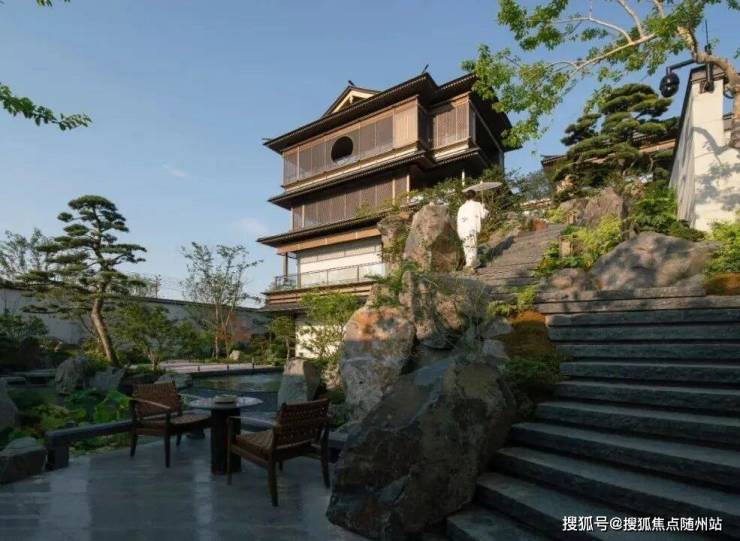 宋代郭熙在论山水画时就提到“但可行、可望,不如可居、可游之为得。”22#“泉香”总建筑面积6676.87㎡,其中庭院占地面积达2672.62㎡,俯瞰呈“L”形布局,全园结构精密得宜,自西南至东北依次设置理水、叠山,磅礴建筑绕院聚合,形成曲径通幽的行进序列。