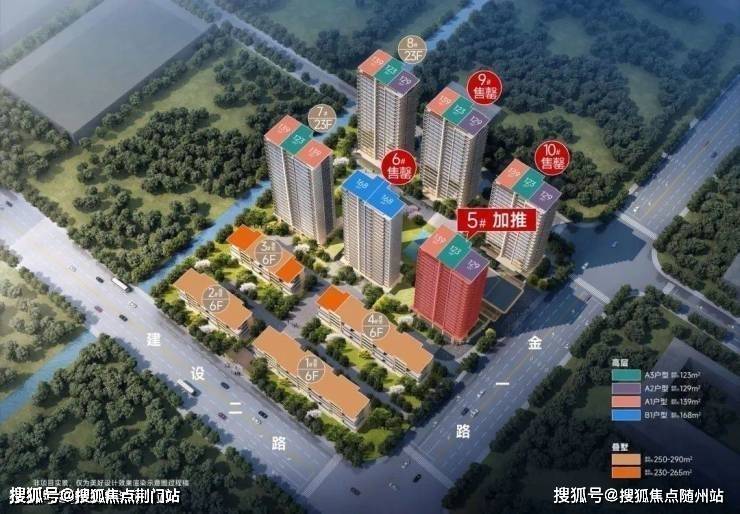 项目位于建设二路与金一路的交会处,依托方正的地形,规划了 6幢高层+4幢叠排,其中高层住宅仅356套。户型方面,本次首开的2幢高层(9、10号楼),主推建面约 123㎡的中间套,以及建面约 129㎡、139㎡的边套,均为四房两厅两卫全明格局。