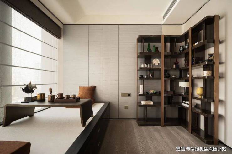 空间布局更是遵循“形制即礼序”的营造法则——对材质比例进行严谨推敲,墙面木作与地面石材的咬合关系暗合黄金分割,功能分区通过进退有度的空间节奏,实现“隔而不断”的呼吸感,让居者始终与自然保持亲密对话。