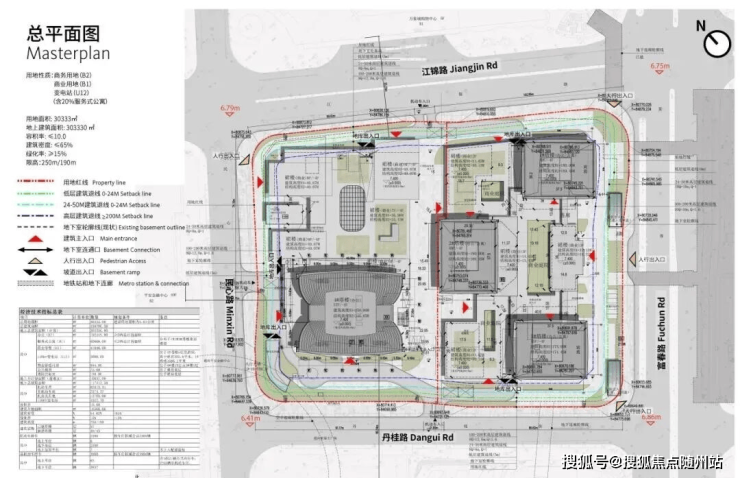 项目由四栋地标建筑构成,一栋249.98米办公塔楼,一栋约175米、两栋约190米大平层塔楼,外加商业裙房及街区式商业空间组成,形成集居住、办公、商业与公共活动于一体的高密度城市综合体。整体规划在强化CBD功能活力的同时,通过清晰的空间层级与多元业态组合,赋予区域鲜明而持久的城市身份。