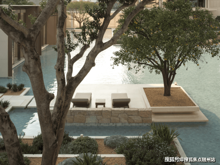 头顶是硕果累累的果树,身边是宁静湛蓝的水面,微风拂过,波光粼粼,坐在树下仿佛心灵都得到了洗涤。它不在遥远的「地中海度假区」,而在杭州非常成熟的城区,同协路上的中天海威·璟逸。