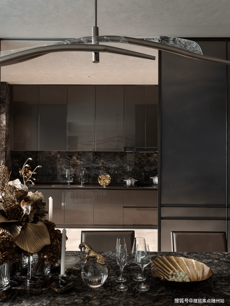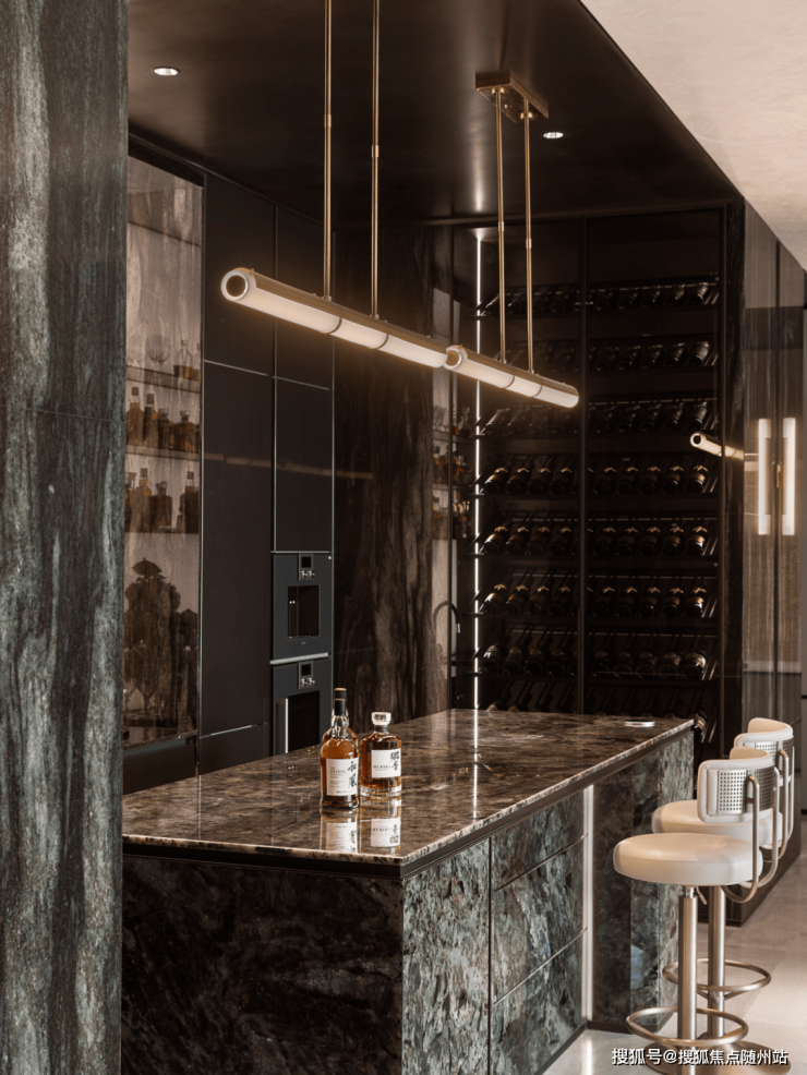 西厨保持着客餐厅的延续性,没有刻意边界。深绿石材岛台在开阔的格局中成为社交轴心。几何形灯具自上垂落,光线打在石材细密的纹理上,温润的反射与酒柜、器皿、杯盏共同构成待客的仪式感,成为衔接生活的节点。