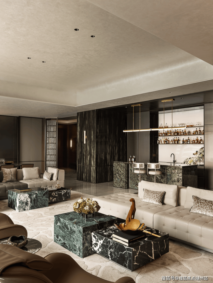 低矮而松弛的沙发围合出交流场域,绿纹石茶几与米色地毯在质感上形成互补,温润与克制并存。