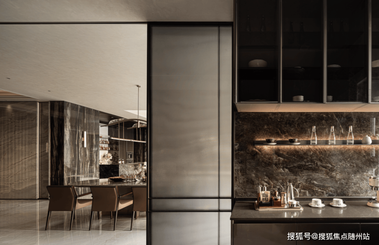 长桌石材深沉的纹理,在餐厅内映衬着波浪形吊灯,光影在金属与石面间流转。暮色下,餐椅围合出附有礼序的交流场域,光线沿着窗边柜体,映照出餐叙时刻的暖意。