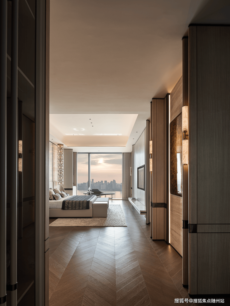 从过道走入私域,木饰面与暖灰石材交替铺展,灯壁与艺术作品点缀其上,像一段被压低声调的序曲,在主卧内,铺垫出细密的节奏。